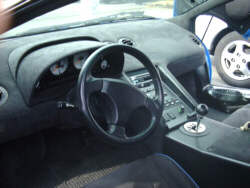 猛牛のコクピット。 とにかく低いっ!! 後ろが見えなくて有名 (?) なこのクルマ、 実は前も良く見えない事が判明しました (爆)。 |