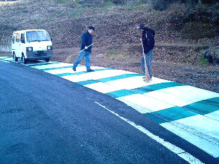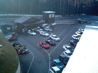 ところが、この寒さと前日の雨の影響で なんと日陰部分が凍結注意。 氷を溶かす係員の皆さん、ガンバレ! しかし結局、時間になっても コースオープンの許可が下りず 走行時間がそのまま短縮されることに(T_T)。 |