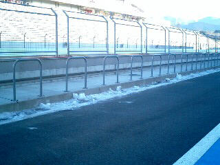 しかしピットロード脇には 真冬を物語る残雪。 やっぱり降ってたのね(^^;)。 |