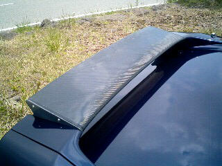 リアスポイラーにアクセント、 純正のラインを崩さない範囲でドレスアップしたいとのことで 某裏庭製(笑)のカーボンウィングを装着。 |