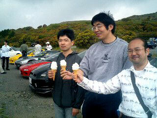というわけでもちろん、 ここにきたら食さねば!のソフトクリームを持つ 隠し砦の3悪・・・もとい関東砦の3聖人(笑)。 アイス食べても寒くない天気で良かった。 |
