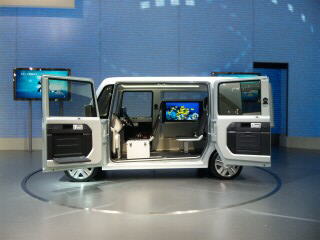 今回のコンセプトカーの中で 面白いなあ、と思ったのがコレ、 ダイハツの「デカデカ」。 もう、そのまんま移動するお部屋。 |