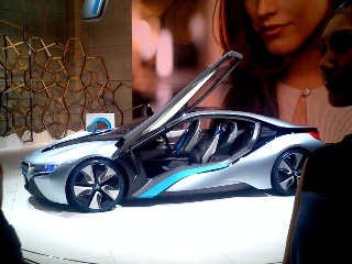 | そしてこちらは 今流行のハイブリッド搭載「BMW i8コンセプト」 前輪がモーター、後輪がエンジンというパワーユニットの 新世代スポーツカー。 これからはスーパーカーもハイブリッドの時代なのね。 |