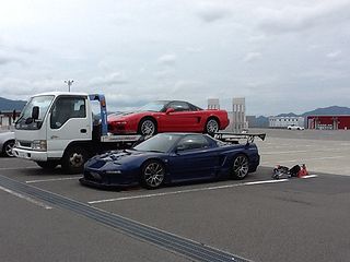 | 現地到着、青Nさんが さっそく準備を始めていました。 いや〜、やっぱりNSXの方がカッコイイな♪(爆) |
