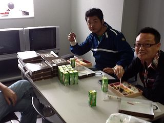 | スタッフさんもお弁当中。 ばっちりカメラ目線、ありがとうございます(笑)。 |