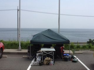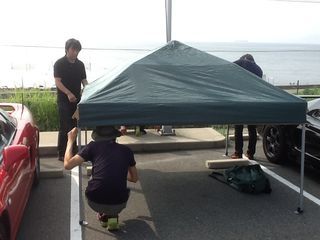 | それにしても暑い! 日除け&荷物置き場として テント設営、これで準備万端です。 |