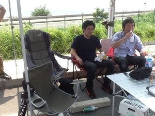 | 風が出てきたので テントの足を縮めて飛ばされないように対策。 しかし、この絵面だけ見てると 何しに来たんだか分からない謎の集団(^^;)。 |