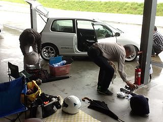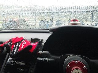 | そんなこんなで走行スタートするも、 エアコン不調でガラスの曇りが取れない! たまらずピットインするkayさん。 「前が見えない〜(T_T)」 |