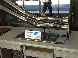 | エントラントには チタンマフラーの展示が。 そういえば、伊藤レーシングって 本物のF1マフラーの手直しも したことがあるらしい、スゴイね。 |