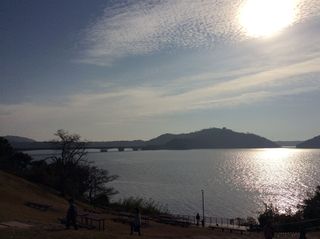 | 勢い余って 早く着き過ぎそうだったんで(^^;)、 集合場所手前の浜名湖SAにて もうひと休み。 湖面に映る朝日が眩しいですね〜 |