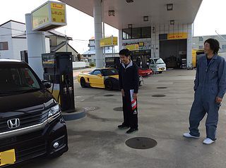 | スパ西浦手前のスタンドで給油。 一見して普通に歩いてるさとるさん、 ヒトの回復力ってすごいです(^^)。 |