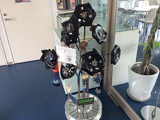 | カメラと一緒に ドライバーも腹ごしらえ。 休憩室脇には 芝刈り機の刃で創った生け花?が 飾ってありました(^^)。 |