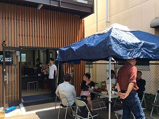 | 事務所入り口脇には 仮設テントも設置、おやつを 頬張りながら歓談するみなさん(^^)。 |