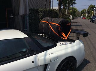 | GTウィングをうまく使った? こんなクルマも来てました。 なんと、ウィングと金属角棒を使って ワンオフのタイヤラックを設置!? こんな運び方してるの初めて見た、世間には ホントいろんな人がいるもんです。脱帽。 |