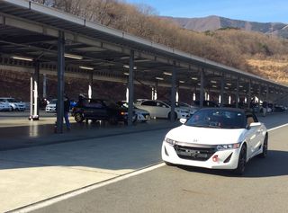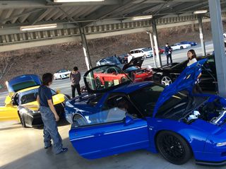 現地到着、 各年代のホンダスポーツがズラリ。 FF、FR、MRと各駆動方式も勢揃い♪ 白率、高いな(^^;) |