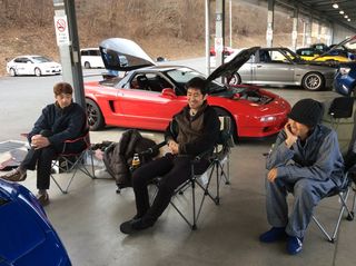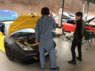 走行後、みんなでくつろぐの図。 いや〜、やっぱりサーキットは楽しいね! |