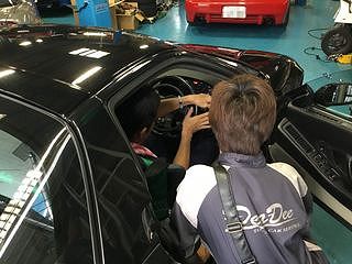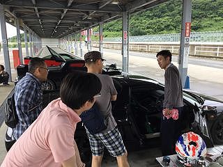 サーキットでの話の続き、 運転装置の微調整について 確認するさとるさん。 |