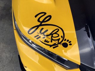 ボンネットに燦然と輝くサインは 660乗りのアイドル、 エンドレスレディの"ゆっきー"さん謹製。 |