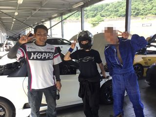 今回は 軽クラスからのスタートでした。 前回同様レーシングスーツに身を包んで 準備万端!Vサインのおおく。さん。 |