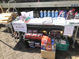 | その賞品と、ステージイベントの じゃんけん大会やくじ引きの景品がいっぱい。 目玉はなんと、無限の限定ステアリング! 良いなあ、ぜひもらって帰りたい(爆) |