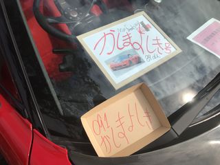 | 同じく協賛品でいただいた記念プレートを クルマにおいて、人気投票用の箱もセット。 気に入ったクルマがあったら これにお菓子を入れるというおもしろ企画。 |