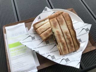 | カフェの屋外テラスからはコースが望めます。 | 春の陽気の下、ホットサンドを頂きました♪ |