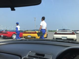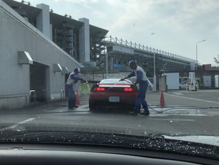 | で、拭き上げはセルフで(笑)。 水が撒かれた路面での走行だったから でしょうけど、まさかの洗車タイムがあるとは・・・ 意外なひと幕でしたが、ここで一回 クルマをキレイに出来るのは嬉しかったですね(^^)。 |