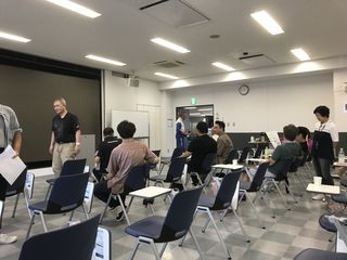 | 夕方からの合流組を待って 正式な開催になるということで、 最初のあいさつは簡潔に済ませて さっそく基礎練の準備。 |