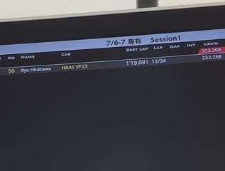 | 何気なく見たモニターには テスト中のベストラップが。 まだ序盤、本気走りじゃないのに 19秒台って、どんだけ速いねん! |