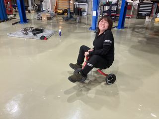 | そんな工場内を 主任の愛車で 爆走するT3津久井さん。 メッチャご満悦! |