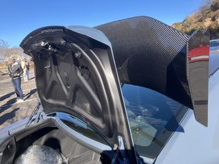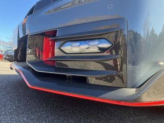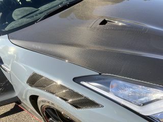 | フロントフェンダーまでカーボン! 余談ですが、フェンダーや バンパーのカーボン部分は塗装で 別体っぽく塗り分けてるだけで、 実は一体成型だそう。 万が一ぶつけたら・・・怖っ! |