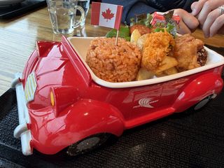 ここらでいったん お昼休みにしましょうか。 見学に来てくれたSさん、 レストランで頼んだお子様ランチも クルマだったことに たいそう感激してました(^^)。 |