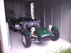その目的地には 何ともう一台のスーパー7が。 この人、このクルマの為だけに ガレージを建ててしまったんだそうだ・・・ (^^;)。 |