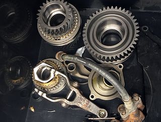 | で、こっちは 交換されたミッション内部品群、 ギアやらシンクロやらフォークやら 色々諸々。おつかれさまでした! |