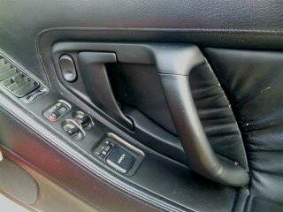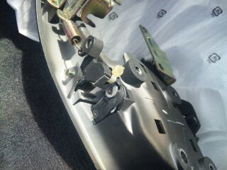 これが悪名高き(爆)ドアノブ。 内側のプラスチック部分が割れて ワイヤーを引っ張れなくなっちゃうんですね。 無理矢理やってたので、 ノブの稼動部分には擦り傷も付いちゃってます。 グリップの黒光り加減も歴史を感じさせますね。 |